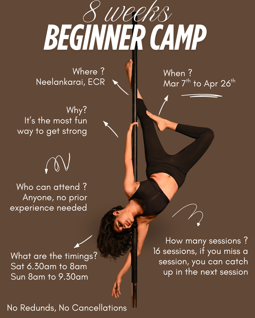 This 8-week pole camp is designed for absolute beginners, with no prior pole or dance experience required.
